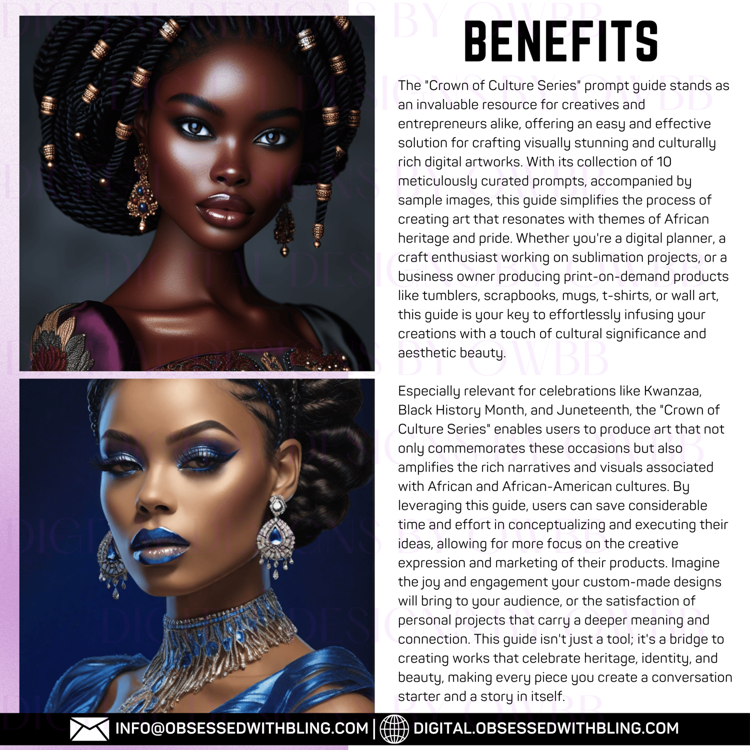 Elevate your creative projects with the "Crown of Culture Series," an exceptional digital art prompt guide designed to inspire and empower artists, crafters, and entrepreneurs. This comprehensive guide is your gateway to producing culturally rich and visually captivating designs, perfect for digital planners, sublimation projects, tumblers, scrapbooking, digital paper, wall art, mugs, t-shirts, and print-on-demand products. Celebrate African heritage and key cultural events like Kwanzaa, Black History Month, and Juneteenth with ease and elegance.